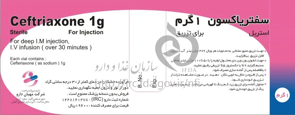 سفتریاکسون 1 گرم پودر برای تهیه محلول تزریقی پرنترال 1 g
