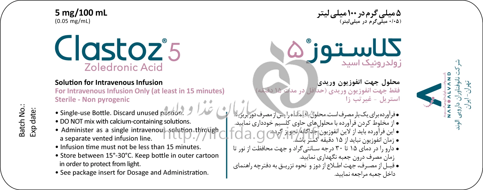 - این دارو باید طی مدت 30-15 انفوزیون ‎ شود. در هنگام انفوزیون نباید داروهای دیگری از این خط انفوزیون تجویز شوند. 2- بیمار بایستی به طور مناسبی قبل از درمان هیدراته شود. 3- محلول دارو قبل از تجویز باید در 100 میلی لیتر نرمال سالین یا دکستروز 5% رقیق شود.