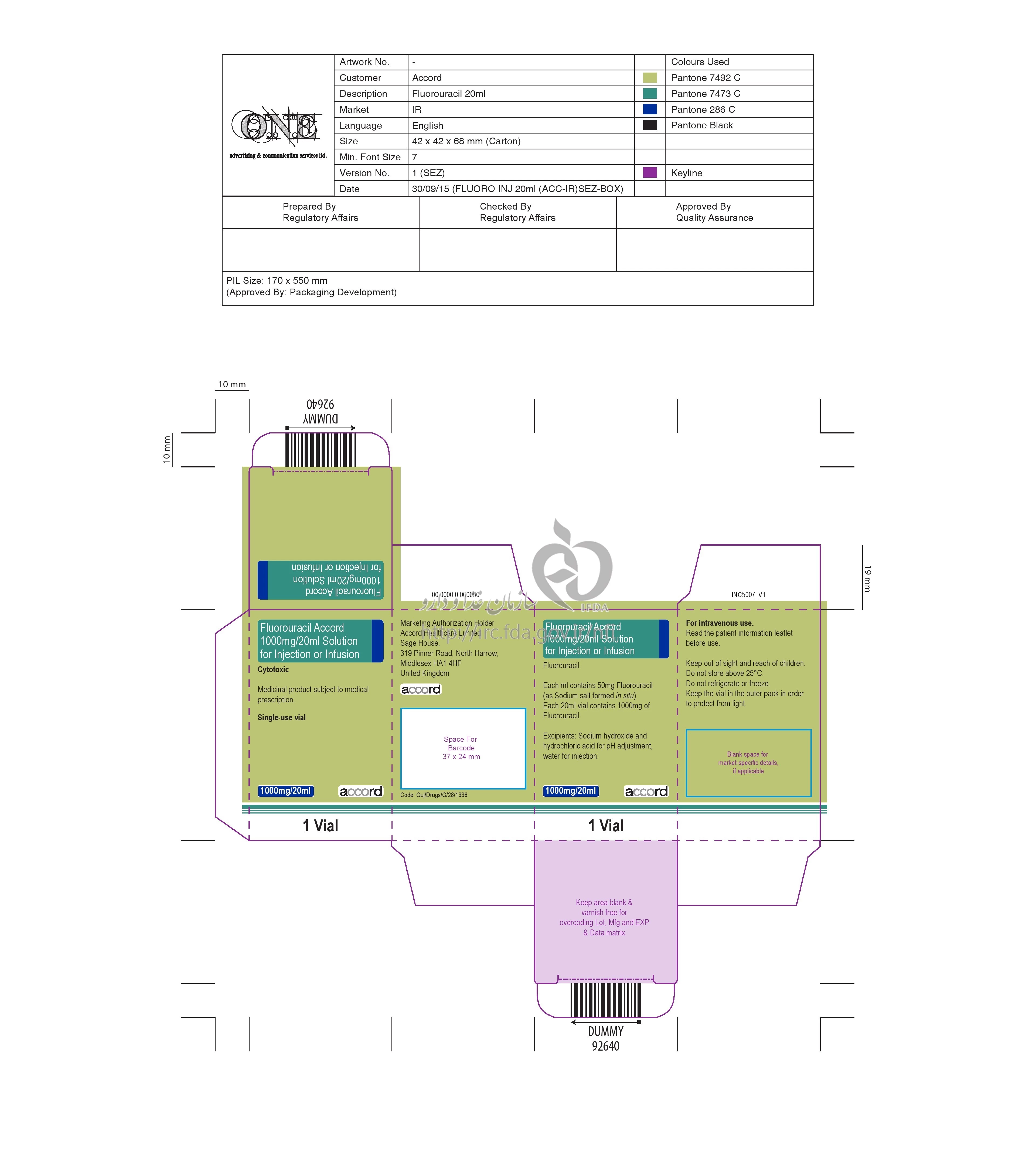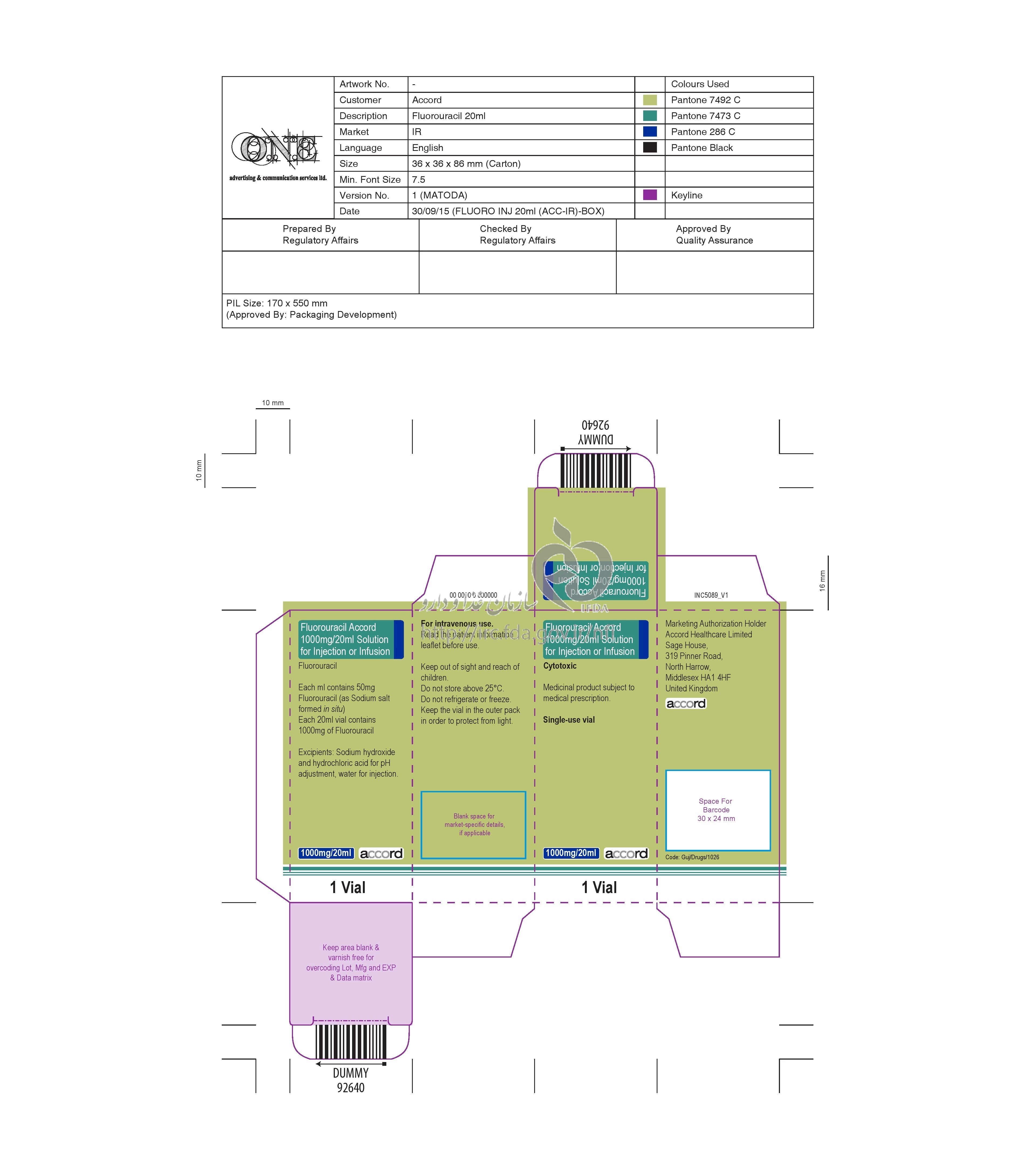 فلورواوراسیل آکورد تزریقی پرنترال 50 mg/1mL 20MILLILITER