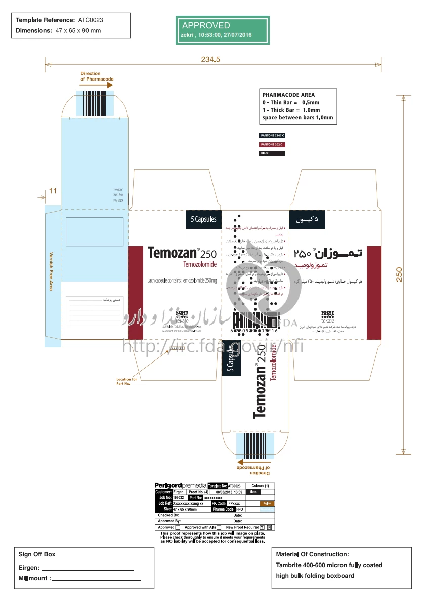 این دارو به همراه پرتودرمانی در بزرگسالان مبتلا به تومورهای مغزی گلیوبلاستوما مولتی فرم و درمان آستروسیتومای آناپلاستیک مقاوم مصرف می شود.