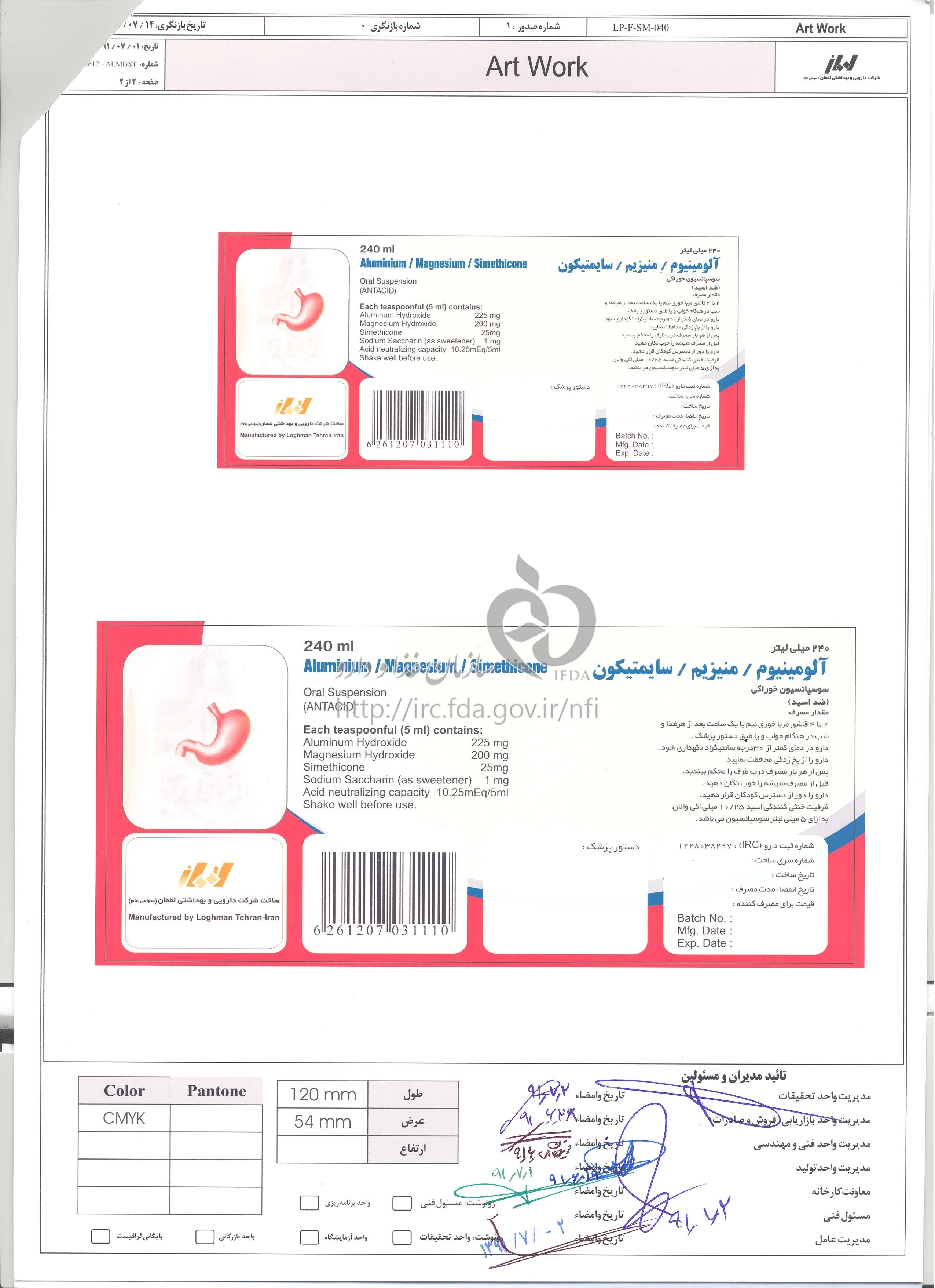 آلومینیوم/منیزیم/سایمتیکون سوسپانسیون خوراکی 225 mg/200 mg/25 mg/5mL 240MILLILITER
