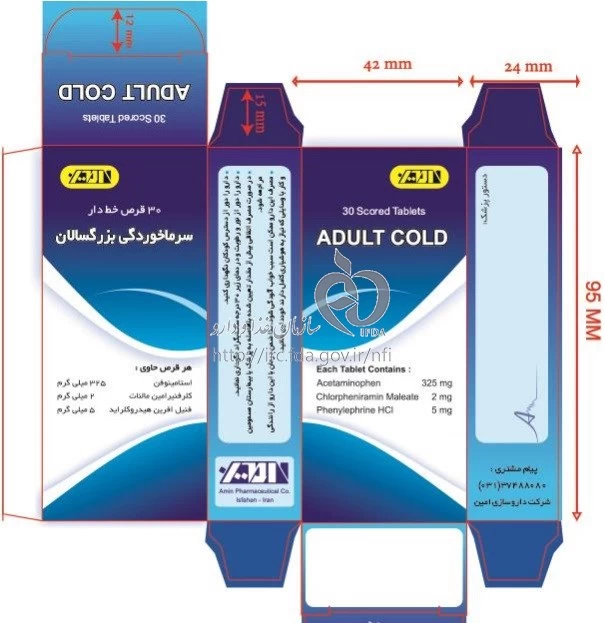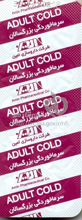 ADULT COLD PREPARATIONS (4) TABLET ORAL 325 mg/5 mg/2 mg برای کاهش علائم سرما، آنفلوآنزا و عفونت های تنفسی بالایی استفاده می شود. این دارو حاوی سه ماده موثره شامل آسپرین (325 میلی گرم)، کافین (5 میلی گرم) و کلرفنیرامین (2 میلی گرم) می باشد. به طور کلی، مصرف این دارو به صورت یک تا دو قرص هر چهار تا شش ساعت یا به تعیین پزشک معالج دوره‌ای مصرف می‌شود. همچنین، حتما قبل از استفاده ازاین دارو، نسبت به مشاوره با پزشک خود اقدام کنید. همچنین، ممکن است بعضی از عوارض جانبی شامل سردرد، تهوع، افزایش خونریزی، افت فشارخون، تشنج و الکلیزم ناشی از نادیده گرفتن محدودیت‌های مصرف این دارو مانند هم‌زمانی با بعضی داروها و مصرف طولانی‌مدت آن، مطرح شود.