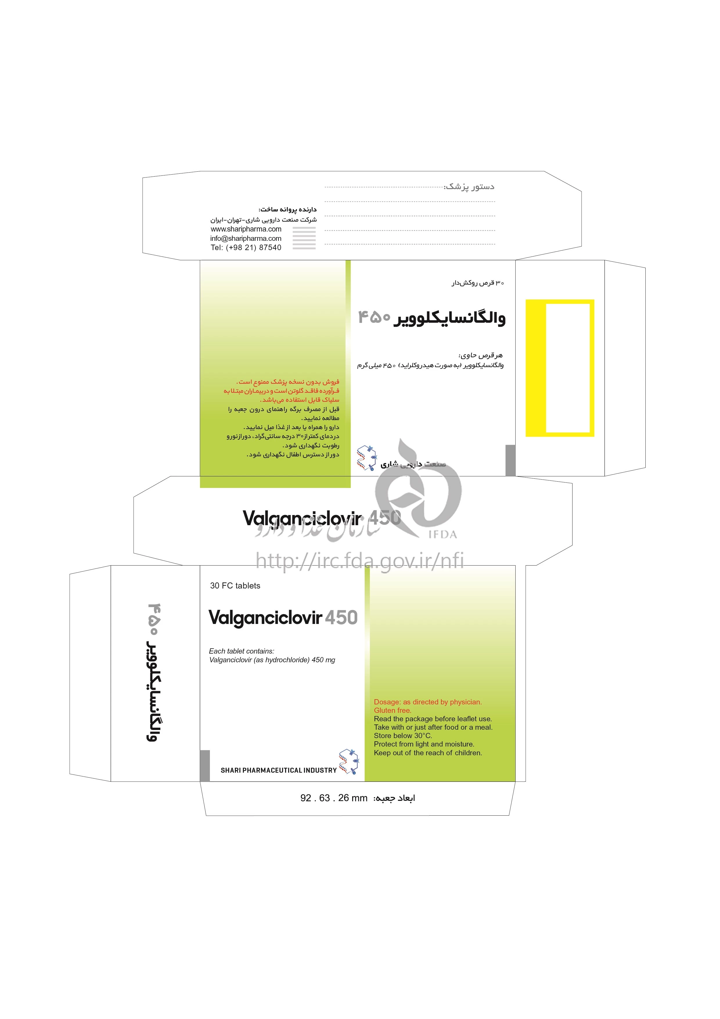 داروی VALGANCICLOVIR (AS HYDROCHLORIDE) TABLET ORAL 450 mg برای درمان عفونت های ویروسی CMV (ویروس سیتومگالوویروس) در بیماران با سیستم ایمنی ضعیف همچون بیماران پس از عمل زایمان و تزریق آمپول زیرین، بیماران با ویروس HIV و تراشیدگی بنیه کلیه تجویز می شود. این دارو به روش خوراکی در قالب قرص مصرف می شود. می توان این دارو را با یک لیوان آب میل کرد. این دارو معمولاً دو بار در روز به صورت ادامه دار (معمولاً به مدت 90 تا 100 روز) تجویز می شود.بهتر است از دارو در دوران بارداری و شیردهی خودداری کنید. همچنین برای درمان این دارو، حتما به دستور پزشک خود عمل کنید.