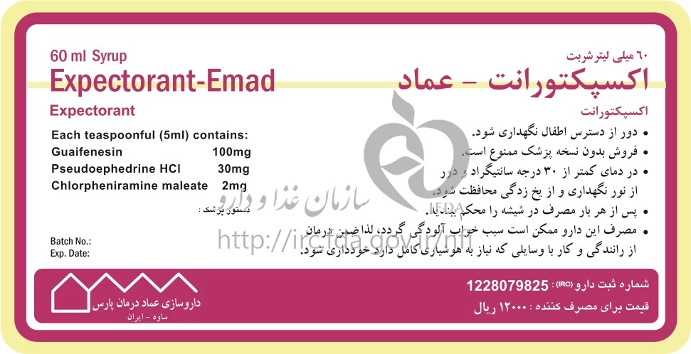 اکسپکتورانت - عماد شربت خوراکی 100 mg/2 mg/30 mg/5mL 60MILLILITER