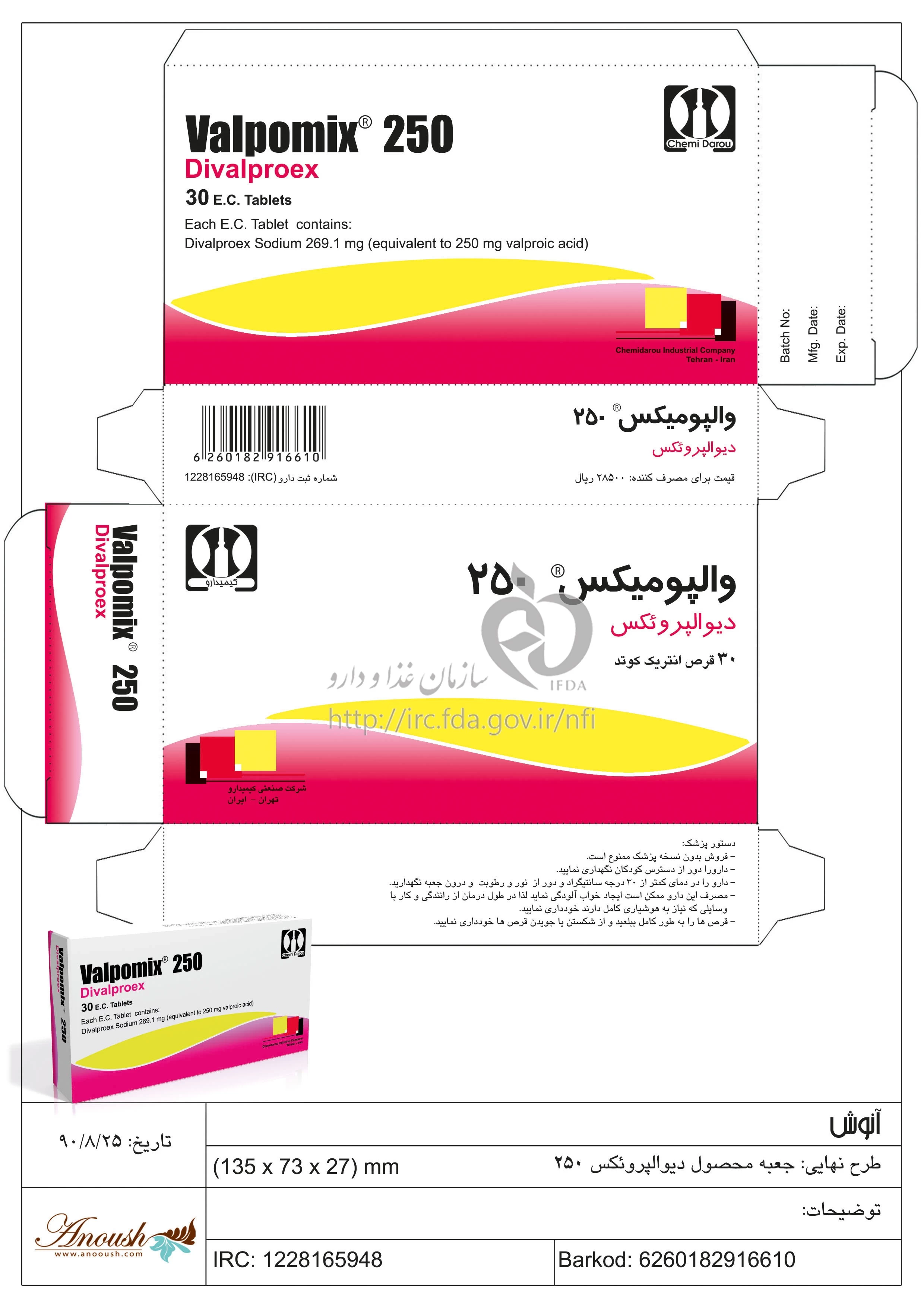 والپومیکس قرص انتریک کوتد خوراکی 250 mg
