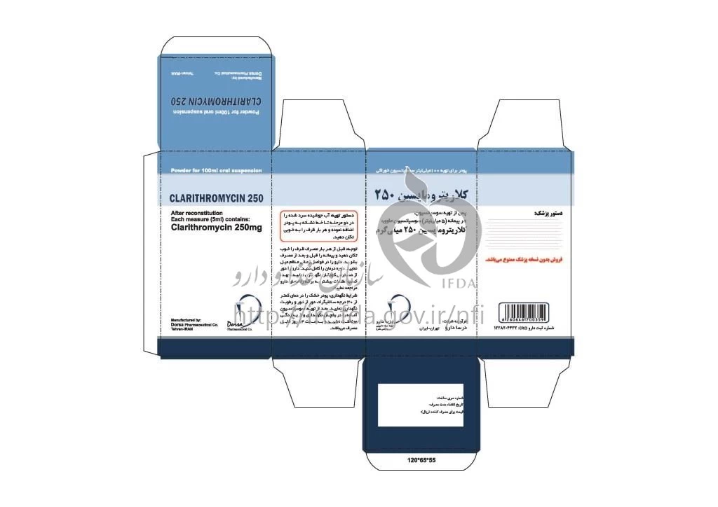 داروی CLARITHROMYCIN یک آنتیبیوتیک است که برای درمان عفونتهای باکتریایی مانند برونشیت، پنومونی، عفونتهای پوستی، عفونتهای جنسی مانند کلامیدیا و ماکوپلاسما و برخی عفونتهای معدهای مانند التهاب مخاط معده و زخم معده مورد استفاده قرار میگیرد. معمولا دو طرح مصرف این دارو وجود دارد: قرص و شربت. برای مصرف شربت، پس از تهیه آن، به دقت دستورالعمل روی بستهبندی دارو را دنبال کرده و دارو را در دستور پزشک خود مصرف نمایید. دز جهت مصرف، احتمالاً به شدت عفونت شما و موقعیت جسمی شما بستگی دارد. غالباً هر 12 ساعت یکبار تجویز می شود ، اما در هر صورت به دستور پزشک معالج پایبند باشید. همچنین ممکن است هیچ علائم بهبودی در حداقل ۳ تا ۵ روز نمایان نشوند و شما بایستی منتظر باشید تا مشکل شما ریشه کن شود.