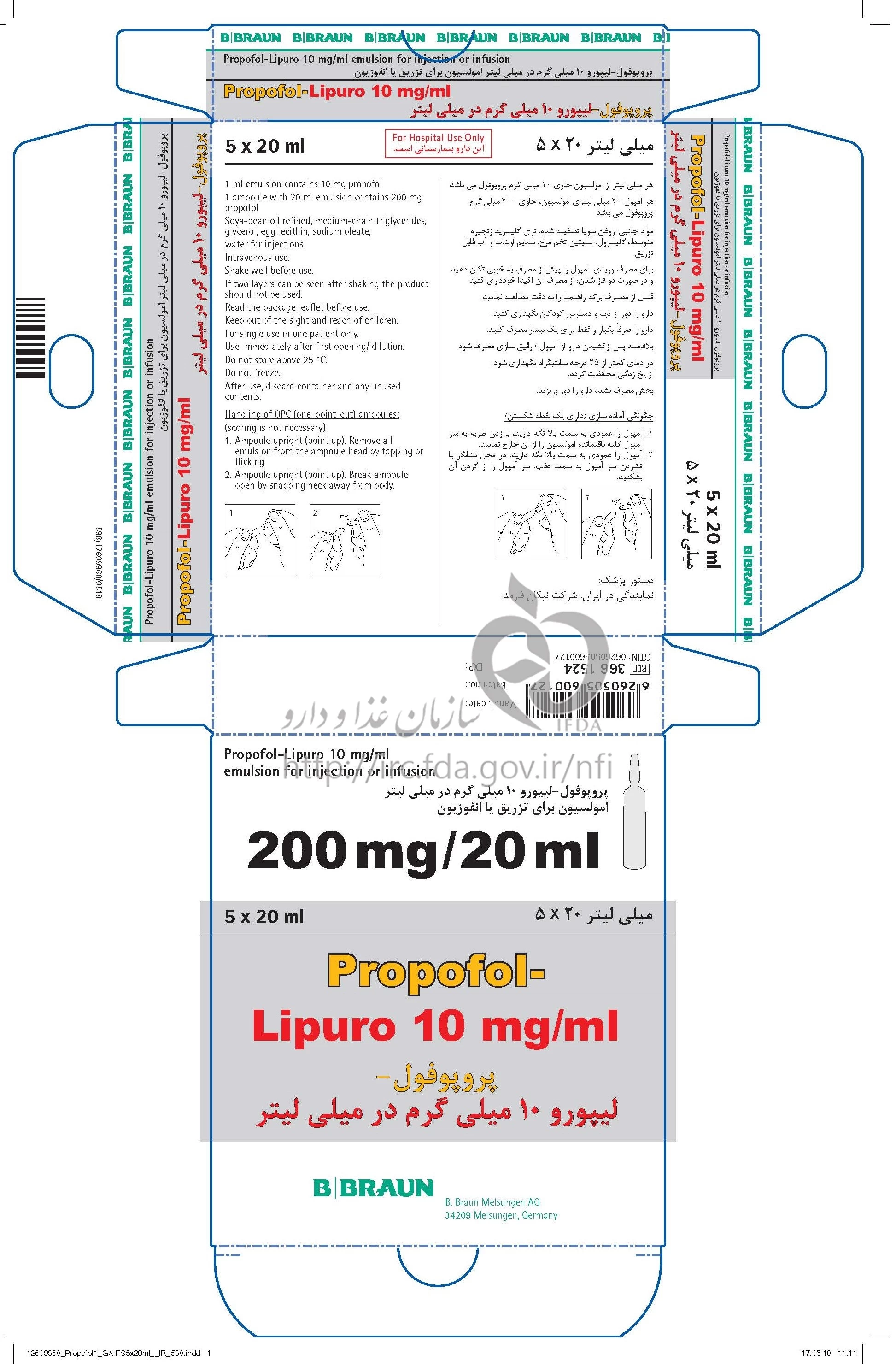 پروپوفول - لیپورو امولسیون تزریقی پرنترال 10 mg/1mL 20MILLILITER
