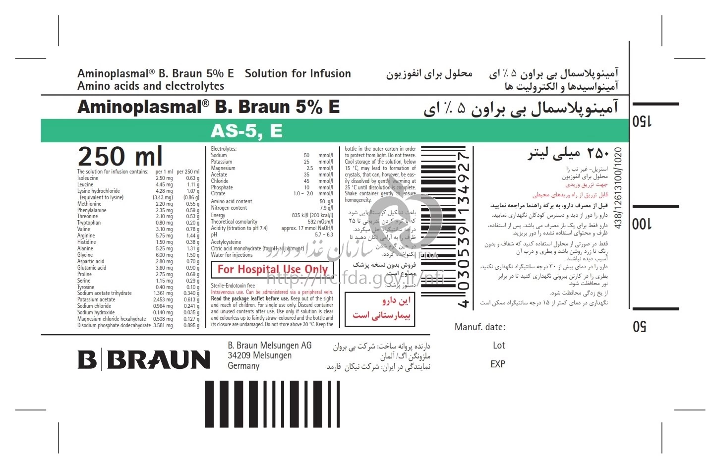 آمینوپلاسمال بی.براون 5% الکترولیت محلول تزریقی داخل وریدی 2.5 mg/4.45 mg/4.28 mg/2.2 mg/2.35 mg/2.1 mg/0.8 mg/3.1 mg/5.75 mg/1.5 mg/5.25 mg/6 mg/2.8 mg/3.6 mg/2.75 mg/1.15 mg/0.4 mg/1.361 mg/0.964 mg/0.14 mg/2.453 mg/0.508 mg/3.581 mg/1mL 250MILLILITER