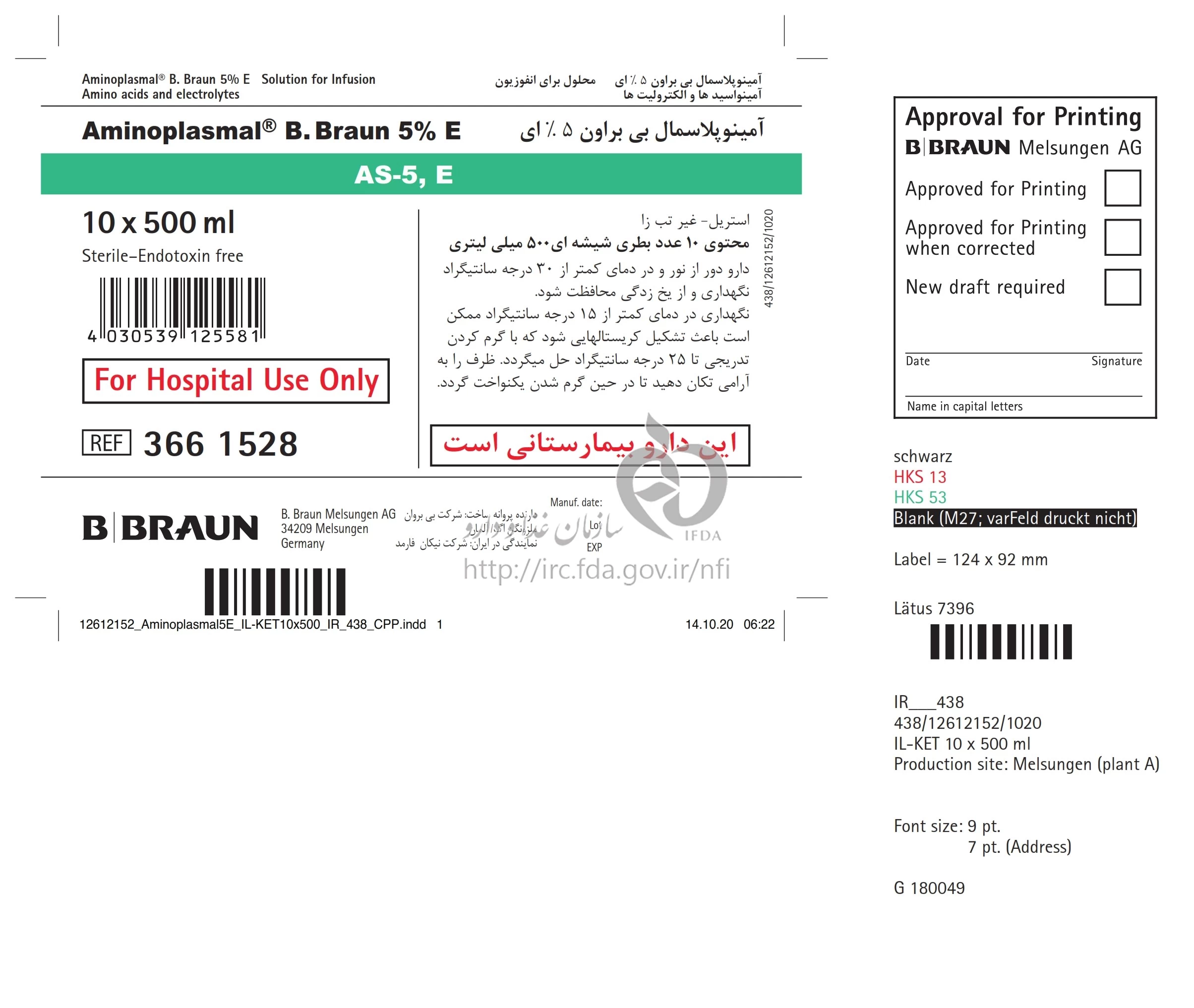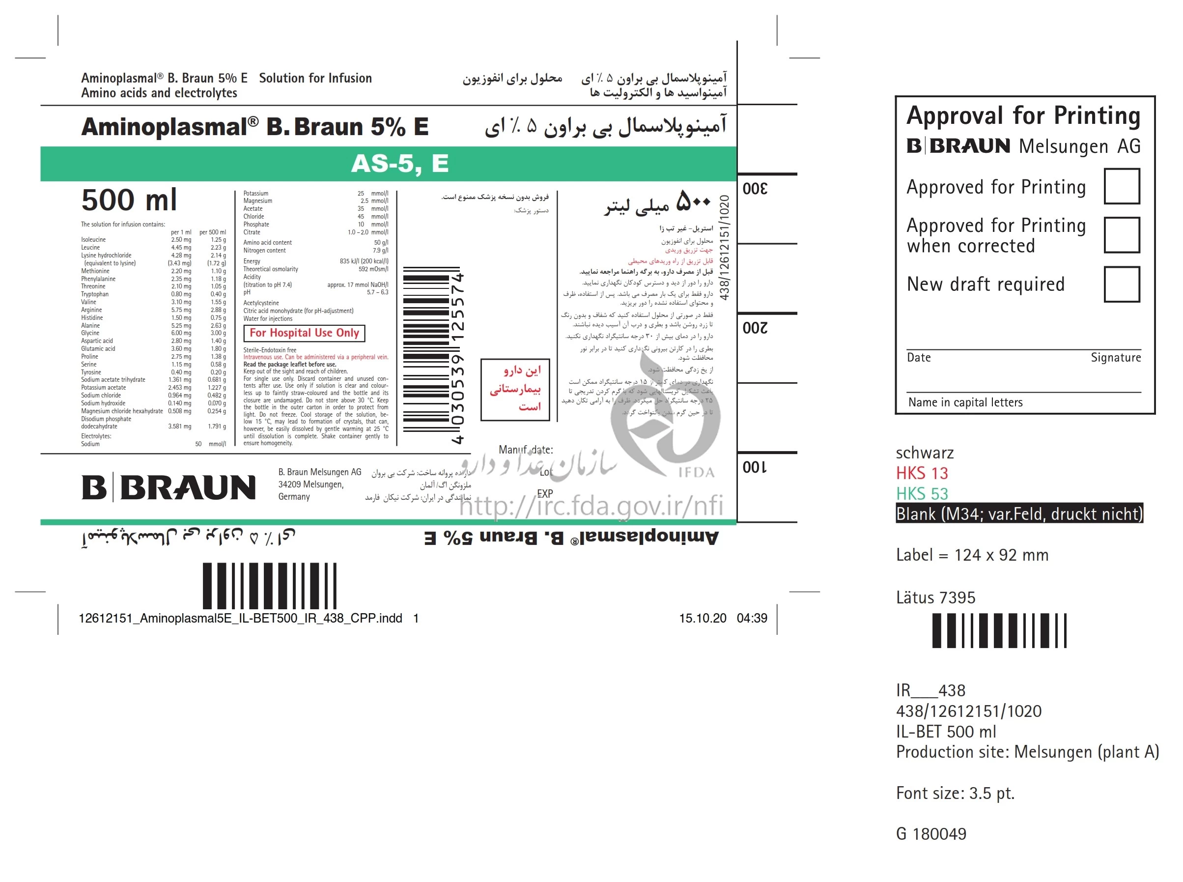 آمینوپلاسمال بی.براون 5% الکترولیت محلول تزریقی داخل وریدی 2.5 mg/4.45 mg/4.28 mg/2.2 mg/2.35 mg/2.1 mg/0.8 mg/3.1 mg/5.75 mg/1.5 mg/5.25 mg/6 mg/2.8 mg/3.6 mg/2.75 mg/1.15 mg/0.4 mg/1.361 mg/0.964 mg/0.14 mg/2.453 mg/0.508 mg/3.581 mg/1mL 500MILLILITER