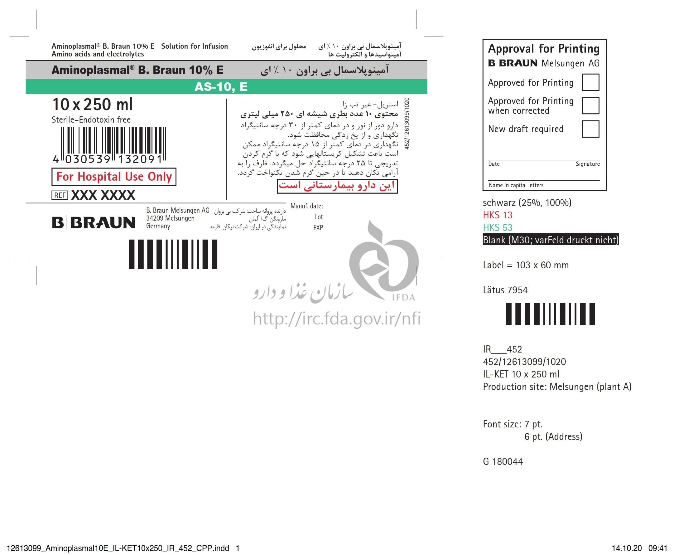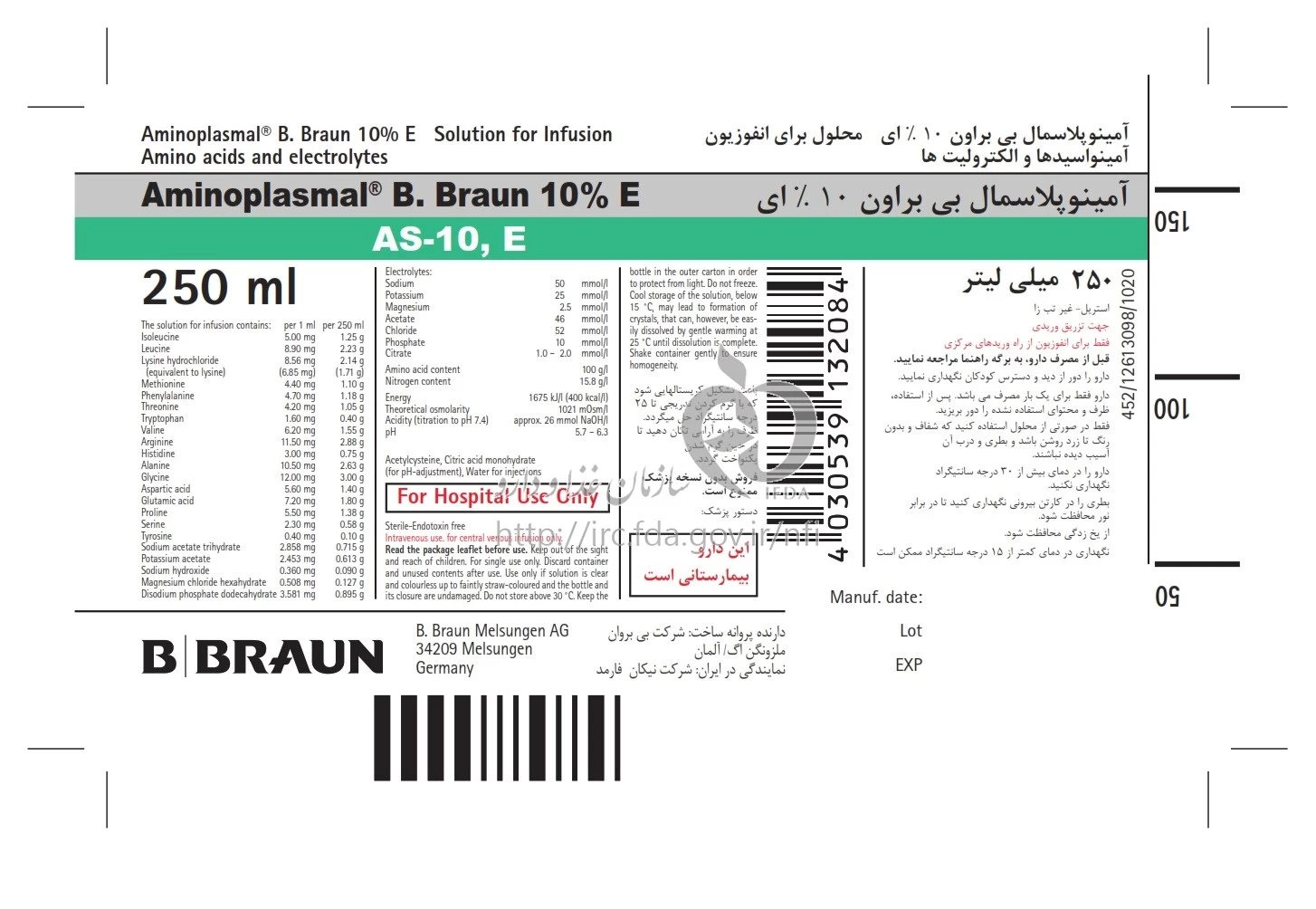 آمینوپلاسمال بی.براون 10% الکترولیت محلول تزریقی داخل وریدی 5 mg/8.9 mg/8.56 mg/4.4 mg/4.7 mg/4.2 mg/1.6 mg/6.2 mg/11.5 mg/3 mg/10.5 mg/12 mg/5.6 mg/7.2 mg/5.5 mg/2.3 mg/0.4 mg/2.858 mg/0.36 mg/2.453 mg/0.508 mg/3.581 mg/1mL 250MILLILITER
