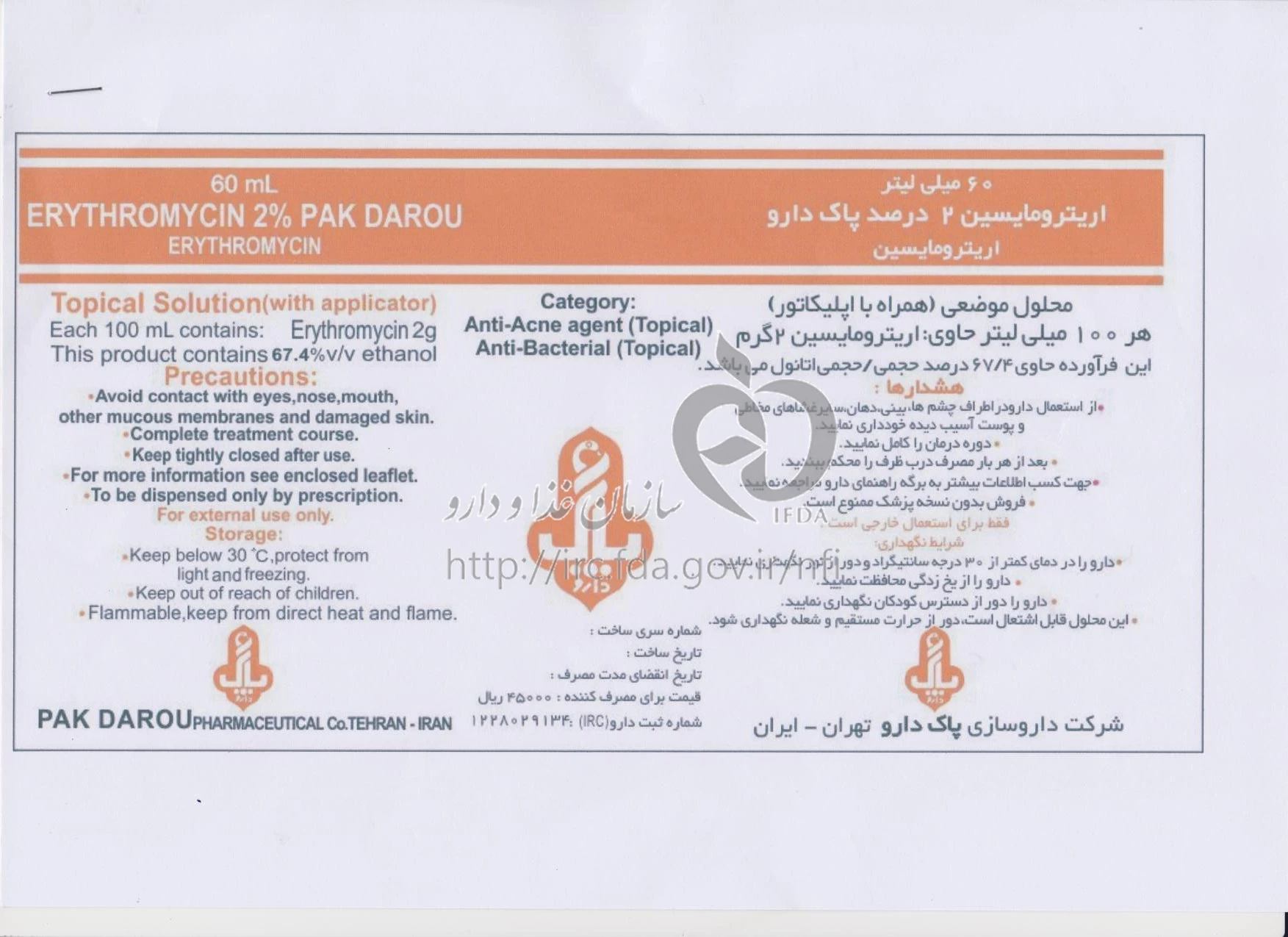 اریترومایسین پاک دارو محلول موضعی 2 % 60MILLILITER