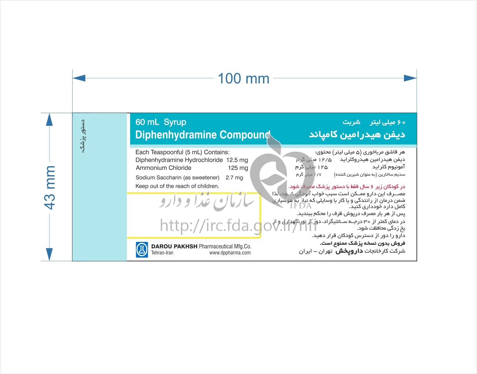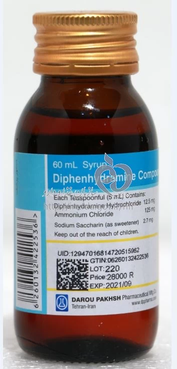 این دارو ترکیبی از دو ماده است: Diphenhydramine و Ammonium Chloride است و برای درمان سرما، سرفه، عطسه و احتقان بینی به کار می‌رود. این دارو با کاهش ترشحات بینی و رفع التهابات دستگاه تنفسی عمل می‌کند. نحوه مصرف این دارو به شرح زیر است: - بطور دقیق دستور پزشک را دنبال کنید. - دارو را با کمی آب میل کنید. - از این دارو معمولاً سه بار در روز استفاده می‌شود. - قبل از استفاده تکان داده شود و با دوزسنج، میزان مصرف وزنی برای کودکان بسته به سن ووزن محاسبه گردد. - داروی DIPHENHYDRAMINE / AMMONIUM CHLORIDE SYRUP ORAL 12.5 mg/125 mg/5mL 60MILLILITER به موقع و بدون تغییر دوز مصرف شود. قبل از مصرف این دارو، بهتر است با یک پزشک یا داروساز مشورت کنید.
