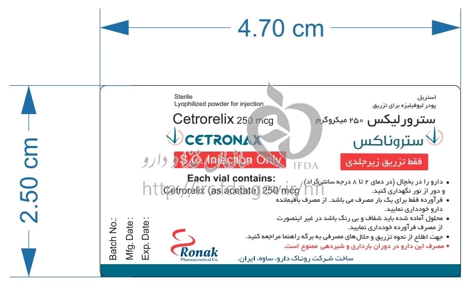 داروی CETRORELIX INJECTION، POWDER، FOR SOLUTION PARENTERAL 250 ug برای درمان علائم ناشی از بیماری های جنسی مانند بیماری اندومتریوز، سندرم تخمدان پلی کیستیک و درمان روش های همبستر ناپلیاور بعد از تزریق ناشی از فرایند بارداری استفاده می شود. معمولاً یک میلیگرم از دارو محلول در حدود ۰٫۲ میلی تا ۲۵۰ میکروگرم در یک تزریق زیر پوست به بیمار تزریق میشود. نحوه مصرف، دوز و زمان تزریق دارو بستگی به دستور پزشک و شرایط بیمار دارد و باید به دقت و بر اساس نوشته شده در روشننامه دارو مصرف شود. قبل از استفاده از دارو، همیشه باید اطلاعات دقیقی از پزشک شما در مورد مصرف داروها و احتیاطهای لازم بدست آورید.