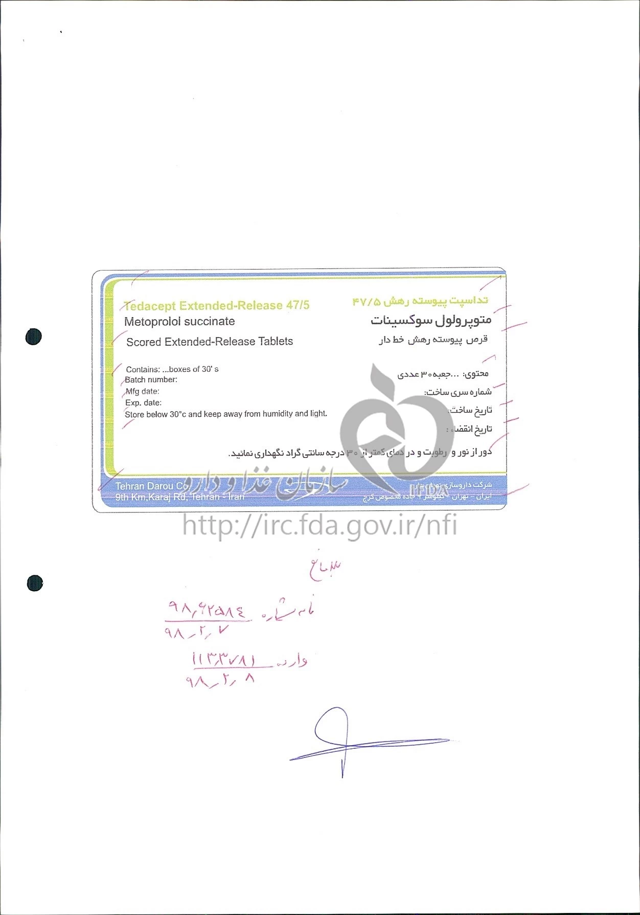 نکات قابل توصیه تداسپت قرص پیوسته رهش خوراکی 47.5 mg