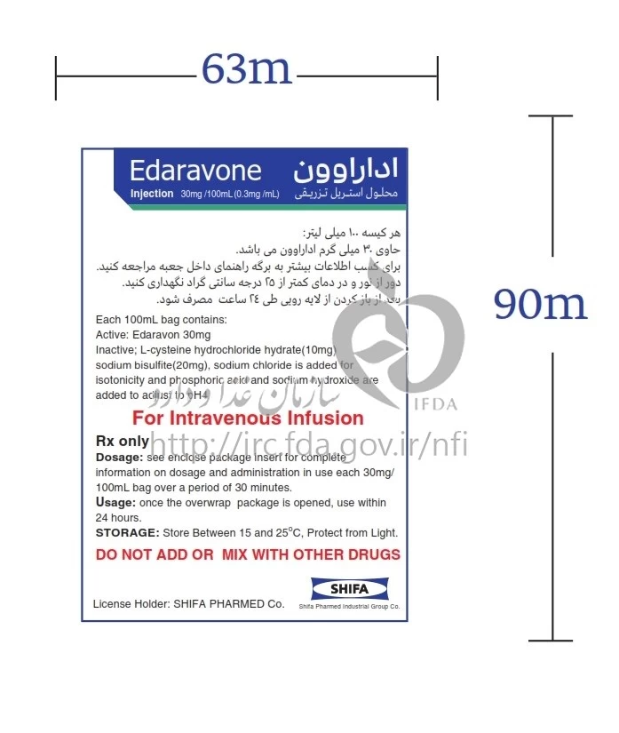 EDARAVONE INJECTION، SOLUTION PARENTERAL 30 mg/100mL برای درمان بیماری آمیوتروفیک جانبی (ALS) استفاده می شود. این دارو در تعداد محدودی از کشورها برای درمان سکته مغزی نیز مورد استفاده قرار می گیرد. نحوه مصرف EDARAVONE INJECTION به دستور پزشک به صورت وریدی (intravenous) صورت می گیرد و به مدت 60 دقیقه تزریق می شود. دوز قرار داده شده برای این دارو 12.5 میلی گرم به طور پیاپی در بازه زمانی 14 روز است و پزشک ممکن است دوز را تنظیم کند. مدت درمان با EDARAVONE INJECTION به علت وجود تأثیرات جانبی می تواند محدود شود.