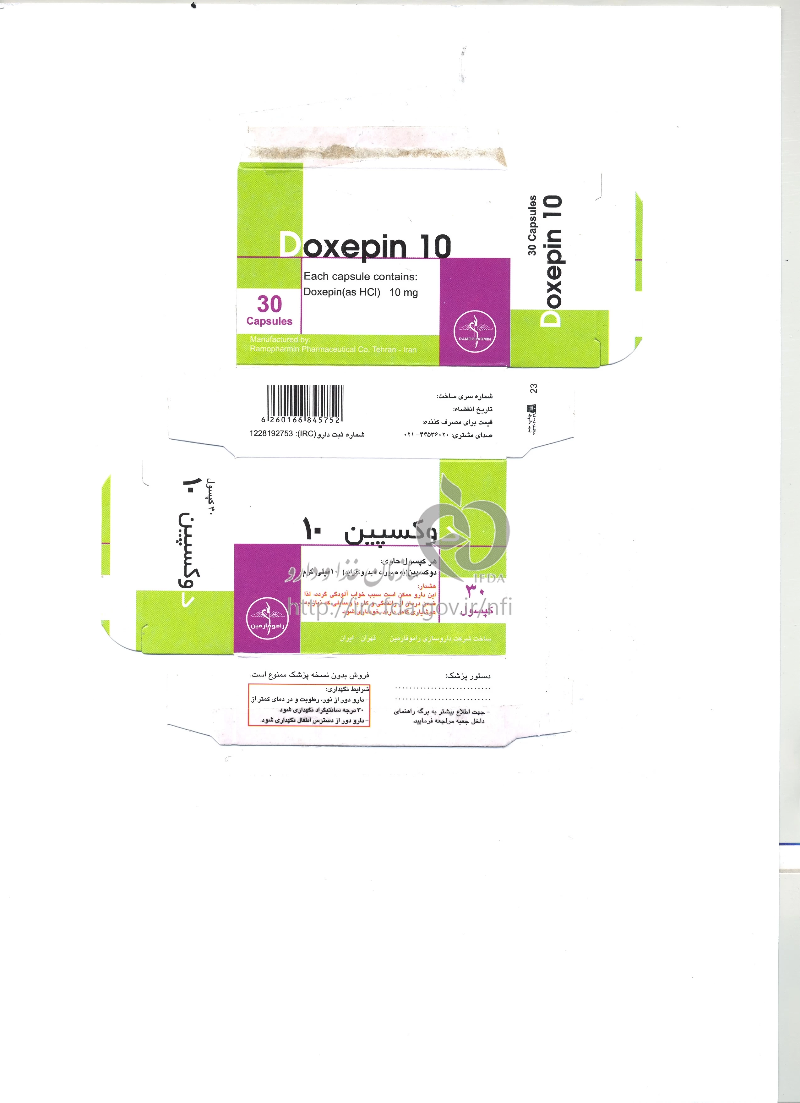 داروی DOXEPIN CAPSULE ORAL 10mg یک داروی ضد افسردگی از دسته داروهای تری سیکلیک است که برای درمان افسردگی، اضطراب و اختلالات خواب استفاده می‌شود. این دارو با کاهش سطح عملکرد سروتونین و نوراپی‌نفرین در مغز، بهبود وضعیت روانی فرد را بهبود می‌بخشد. نحوه مصرف این دارو به چشم انداز پزشک و با توجه به وضعیت بیمار و علائم او تعیین می‌شود. معمولاً، شروع دارو با دوز کمتر از ۱۰ میلی‌گرم به مرور افزایش پیدا می‌کند. به صورت عمده، این دارو روزانه یکبار، در عرض چند هفته تا چند ماه استفاده می‌شود. مصرف این دارو باید تحت نظارت پزشک باشد.