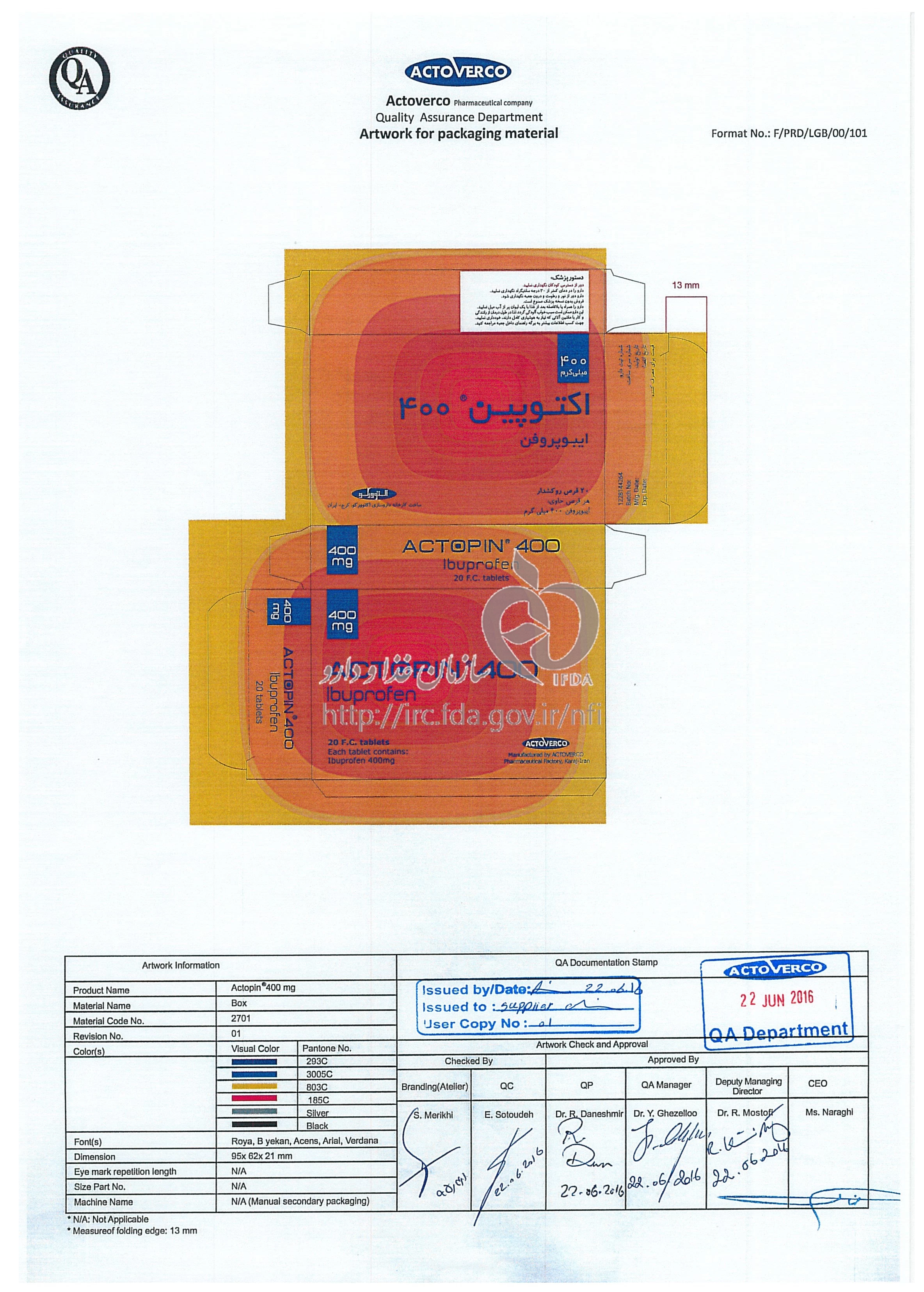 در مصرف همزمان با آنتی اسيدها احتمال كاهش جذب دارو وجود دارد. مصرف ايبوپروفن به -همراه مهاركننده ‎‌هاي آنزيم مبدل آنژيوتانسين (ACE)، سبب معكوس نمودن اثر ضدفشار خون آن ها گرديده و نيز خطر نارسايي كليه و افزايش پتاسيم خون احتمالاً افزايش مي ‎يابد. اثرات كاهنده فشار خون مدرها در صورت مصرف همزمان با اين دارو ممكن است كاهش يابد. اثر انسولين و دارو‌هاي پايين آورنده قندخون سولفونيل اوره، احتمالاً‌ به وسيله اين دارو افزايش مي‎ يابد. مصرف همزمان با سيكلوسپورين خطر سميت كليوي را افزايش مي‌ دهد. دفع ليتيم و احتمالاً متوتركسات توسط ايبوپروفن كاهش يافته و سميت آن ها افزايش مي‎ يابد. مهار تجمع پلاكت توسط اين دارو در زخم و خونريزي گوارشي در بيماران تحت درمان با دارو‌هاي ضدانعقاد يا ترومبوليتيك، ممكن است خطرناك باشد. مصرف همزمان اين دارو با آسپيرين توصيه نمی-‌شود. مصرف همزمان اسيد والپروئيك با اين دارو خطر بروز خونريزي را به دليل تداخل در عملكرد پلاكت ‎‌ها افزايش مي ‌دهد.