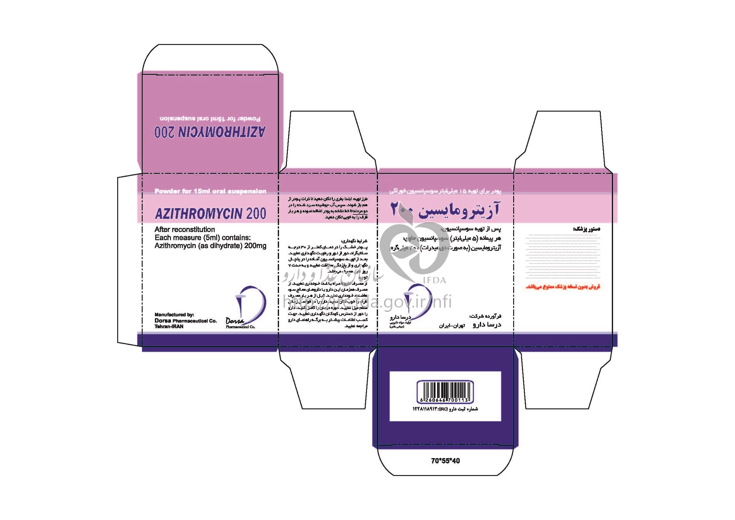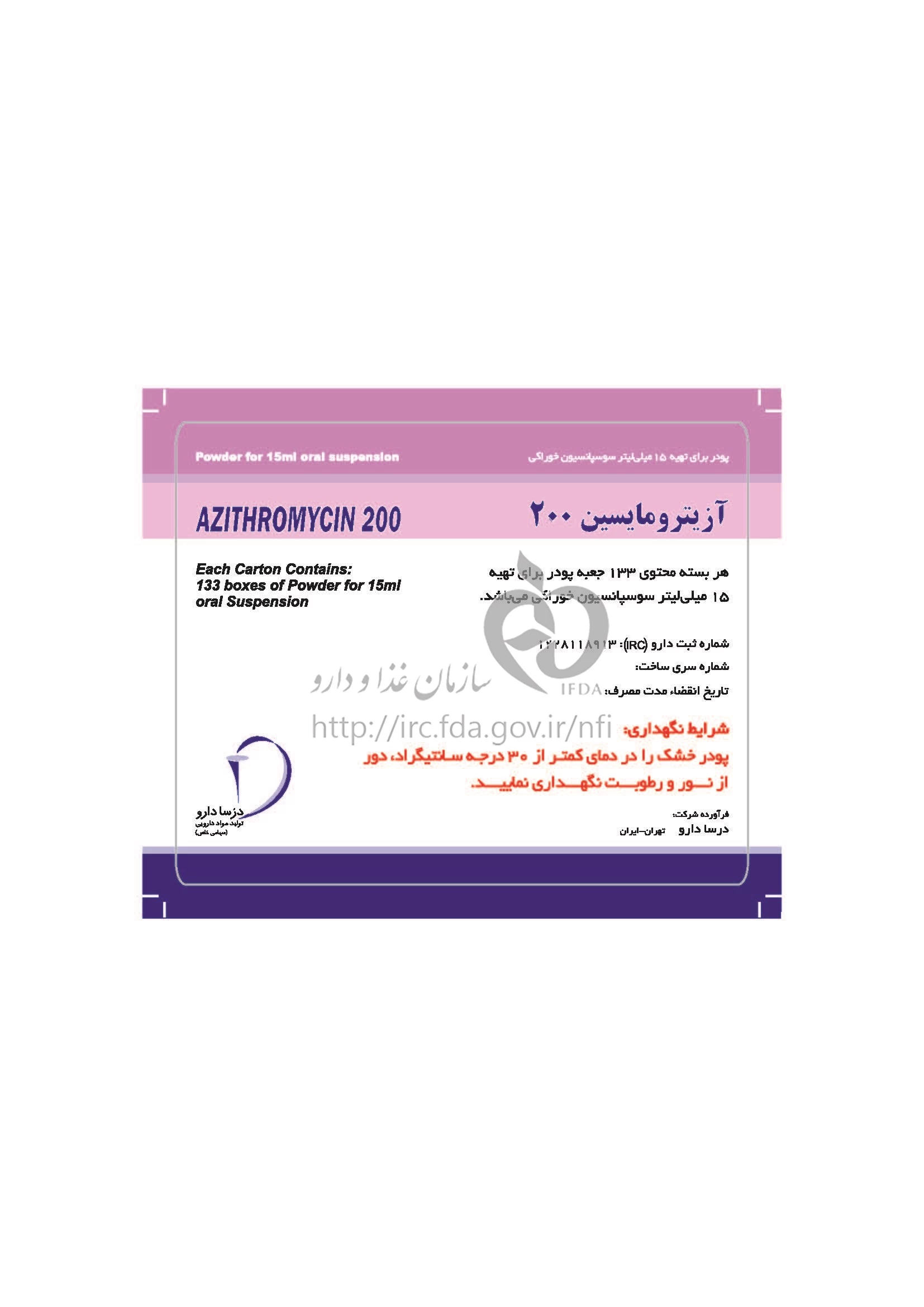 آزیترومایسین پودر برای تهیه سوسپانسیون خوراکی 200 mg/5mL 15MILLILITER