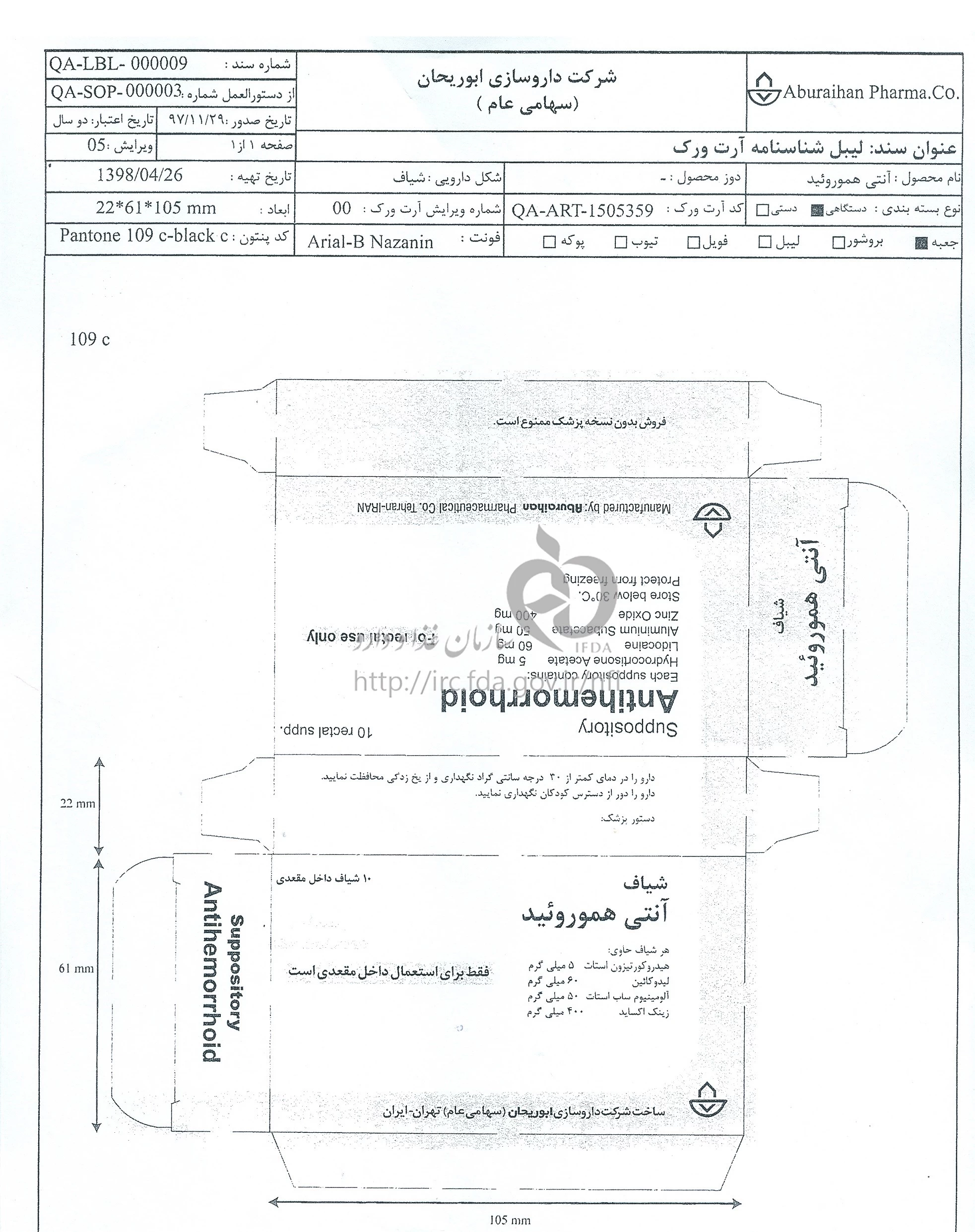 آنتی هموروئید شیاف مقعدی 60 mg/5 mg/50 mg/400 mg