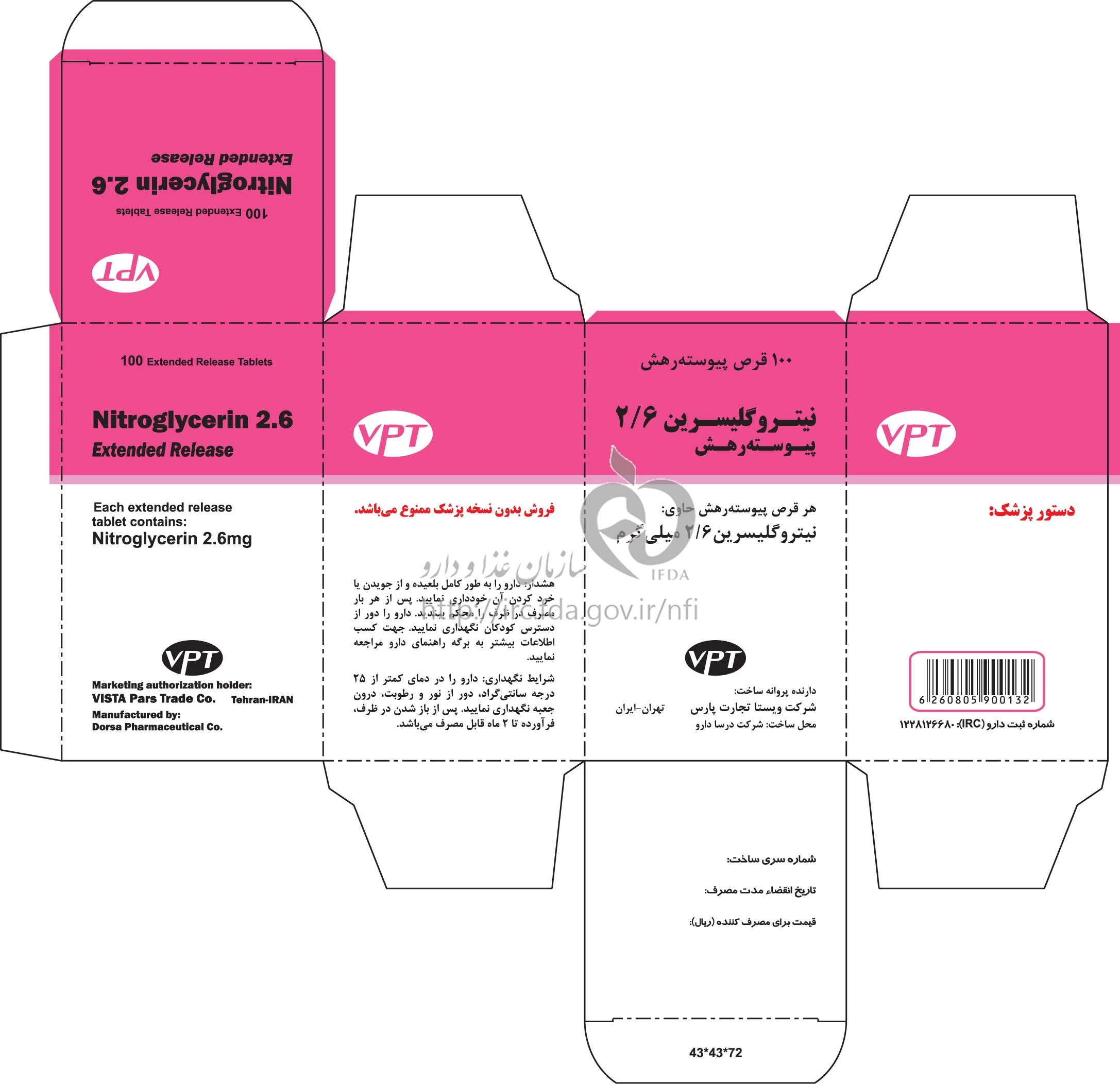 نیتروگلیسرین قرص پیوسته رهش خوراکی 2.6 mg