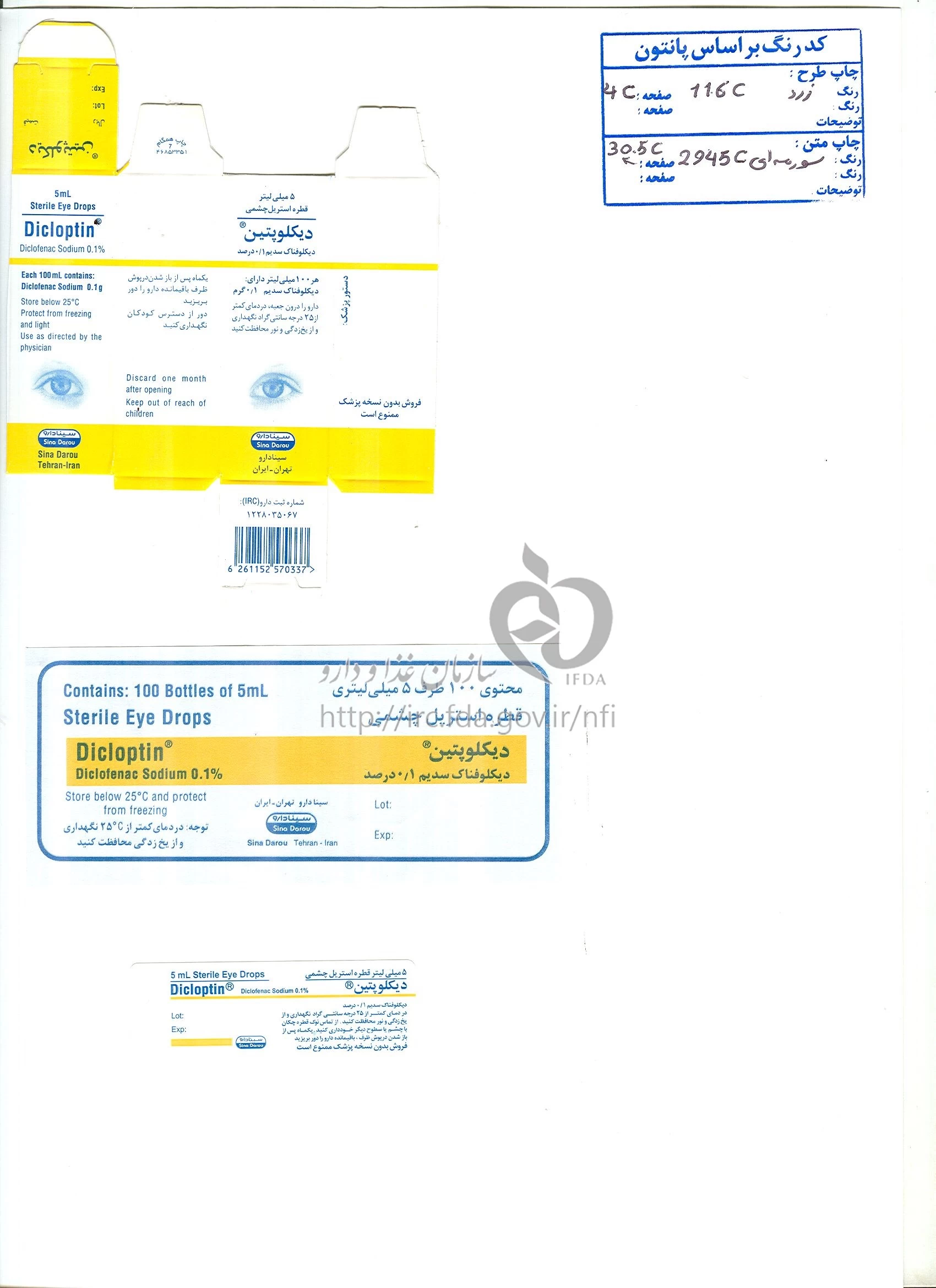 DICLOFENAC SODIUM SOLUTION, DROPS OPHTHALMIC 0.1 % 5ML یک قطره چشمی است که برای کاهش التهاب و درد چشمی استفاده میشود. این دارو برای درمان بیماریهایی همچون التهاب و بیماریهای جلوی چشمی مانند اگزما، اسکلریت، یووآیتیس و درماتیت جفتچشمی تجویز میشود. نحوه مصرف این دارو به دستور پزشک است و باید به طور دقیق دنبال شود. اغلب در حدود یک قطره در چشم تحت تأثیر قرار میگیرد تا هر 6 تا 8 ساعت یکبار استفاده شود. قبل از استفاده از این دارو، دستها با آب و صابون بشوئید و در صورتی که لنز چشمی دارید، از چشم بیرون بیاورید. همچنین، پیش از استفاده از این دارو، باید نکات احتیاطی مانند حساسیت به دارو و بهبود کامل از جراحی چشم را به پزشک خود اعلام کرده و دستورالعملهای پزشک را رعایت کنید.