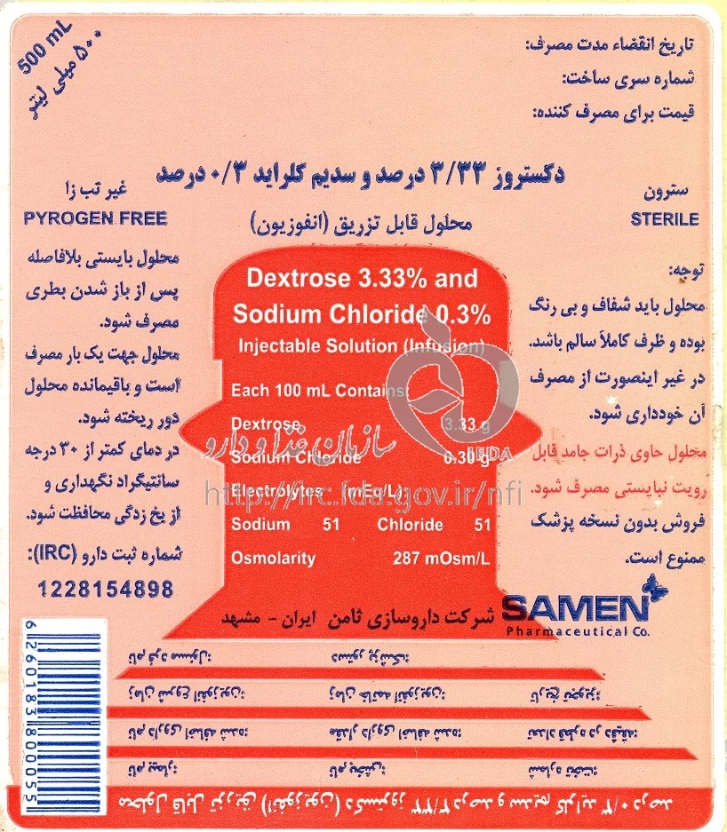 دکستروز/سدیم کلراید محلول تزریقی داخل وریدی 3.33 %/0.3 % 500MILLILITER