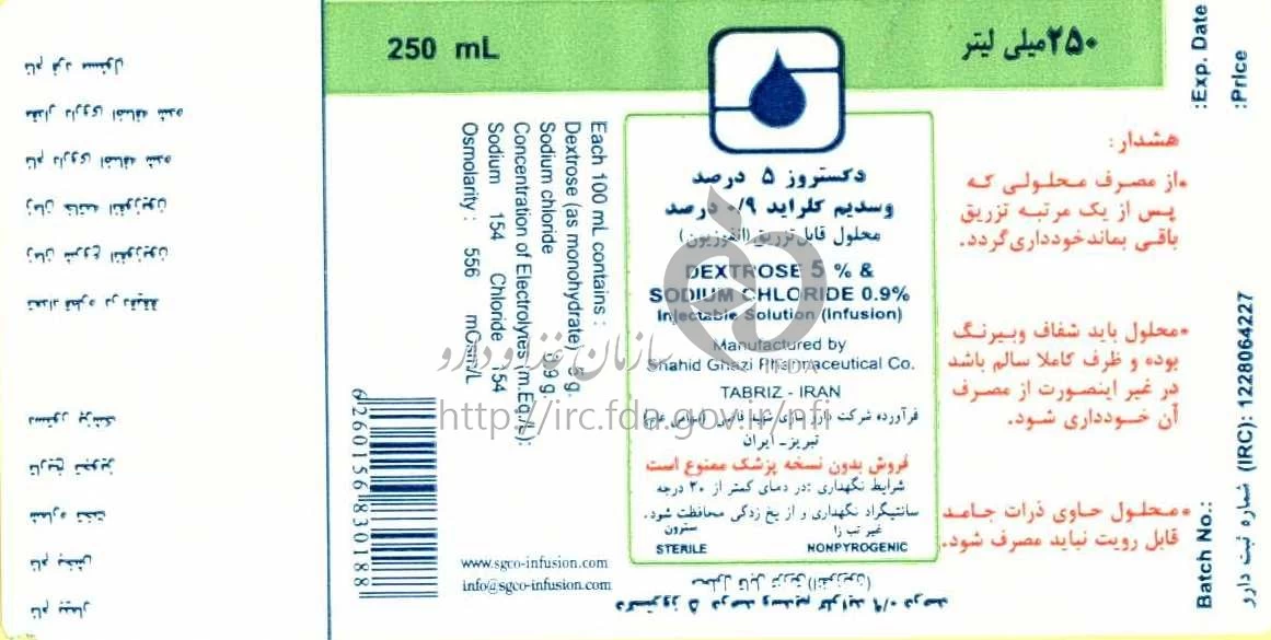 دکستروز/ سدیم کلراید محلول تزریقی داخل وریدی 5 %/0.9 % 250MILLILITER