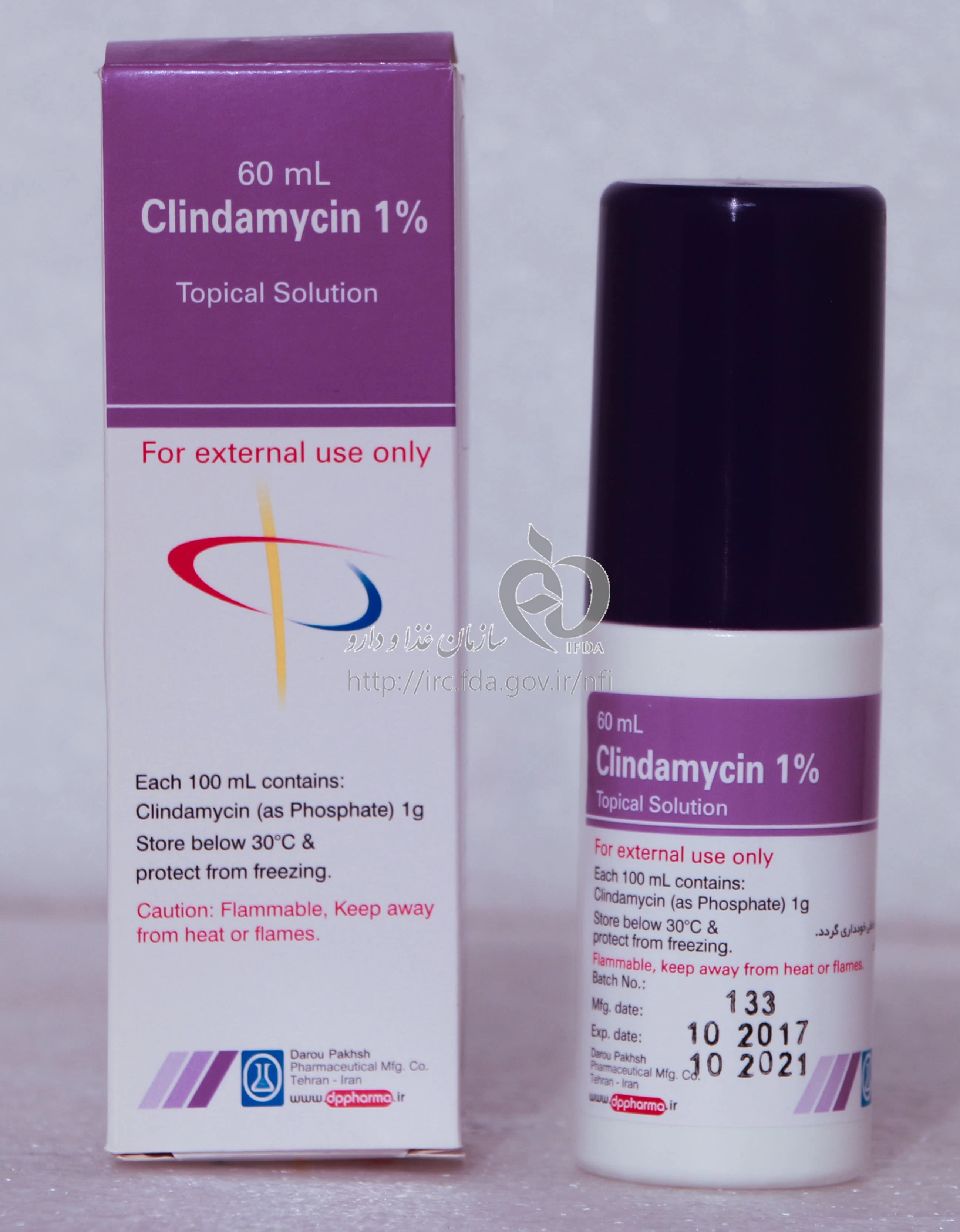 داروی Clindamycin Solution Topical 10 mg/1mL 60mL برای درمان عفونت های پوستی باعث شده توسط باکتری ها مانند آکنه و ترشح چربی موثر است. این دارو به عنوان یک آنتی بیوتیک محسوب می شود. نحوه مصرف این دارو به منظور درمان مشکل پوستی، عبارت است از: 1. پوست را با آب و صابون تمیز کنید و به خوبی خشک کنید. 2. محتویات بطری را با ملاحظه دستورالعمل های داروساز بر روی پوست آسیب دیده بمالید. 3. بهتر است دارو را با دست کمی بمالید و پوست را به راحتی جذب کنید. 4. در صورت استفاده از بیشتر از یک دارو، فاصله خاصی بین دو استفاده وجود نخواهد داشت، به شرطی که مراقب باشید که پوست خشک باشد. 5. دارو را باید مطابق با دستور پزشک درمان کنید. همچنین، قبل از مصرف این دارو باید به دقت دستورات پزشک یا داروساز را مطالعه کنید.