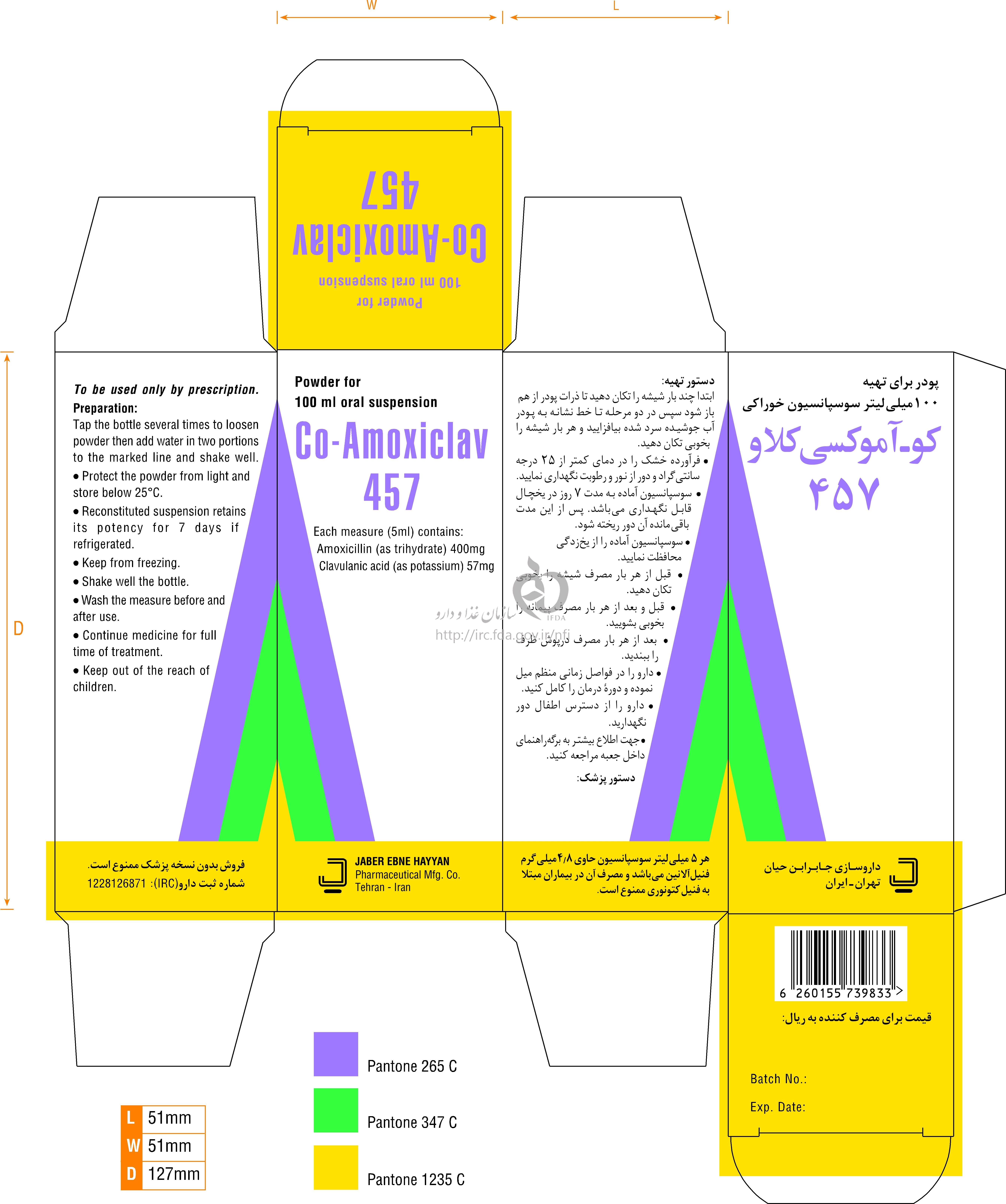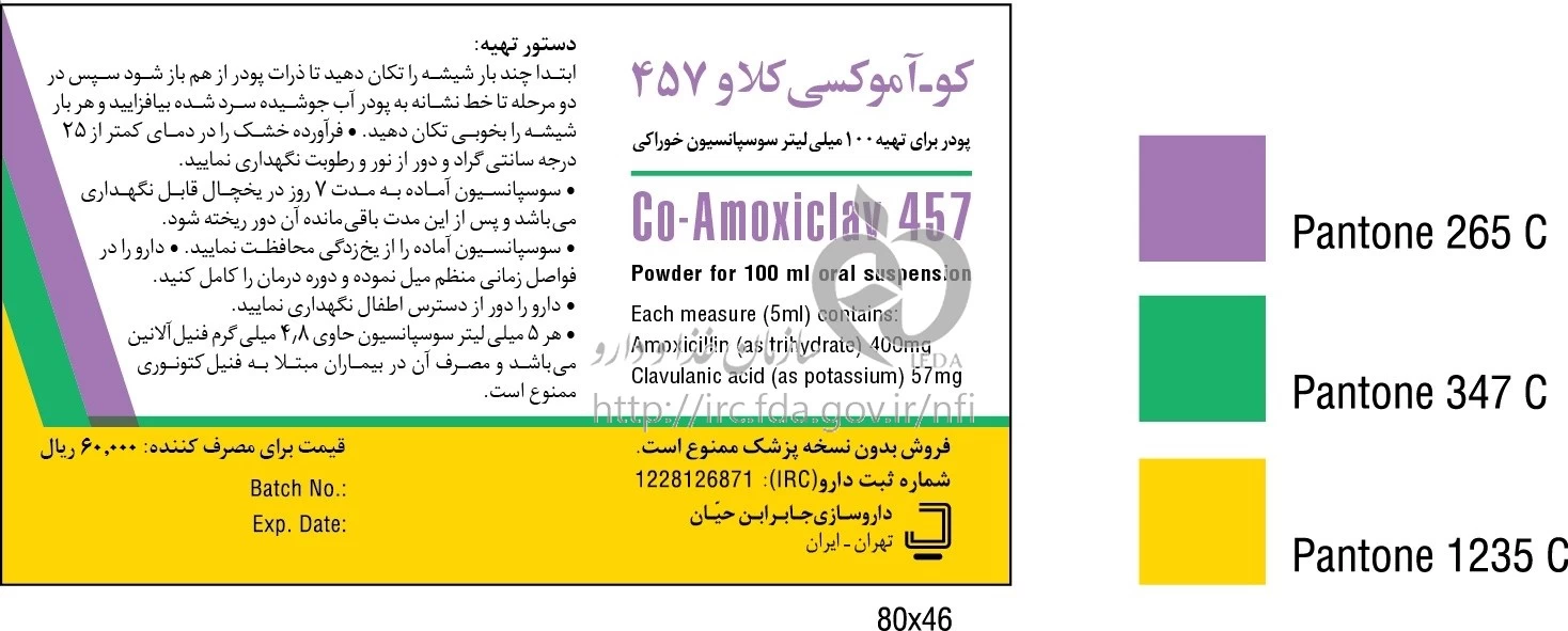 کو - آموکسی کلاو پودر برای تهیه سوسپانسیون خوراکی 400 mg/57 mg/5 mL 100MILLILITER