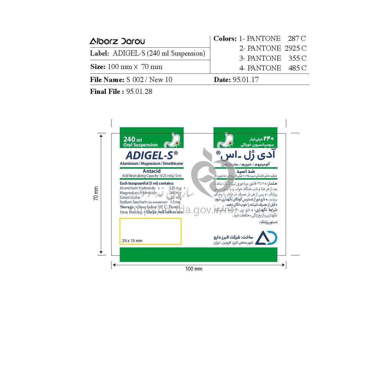 دکترها آدی ژل - اس سوسپانسیون خوراکی 225 mg/200 mg/25 mg/5mL 240MILLILITER