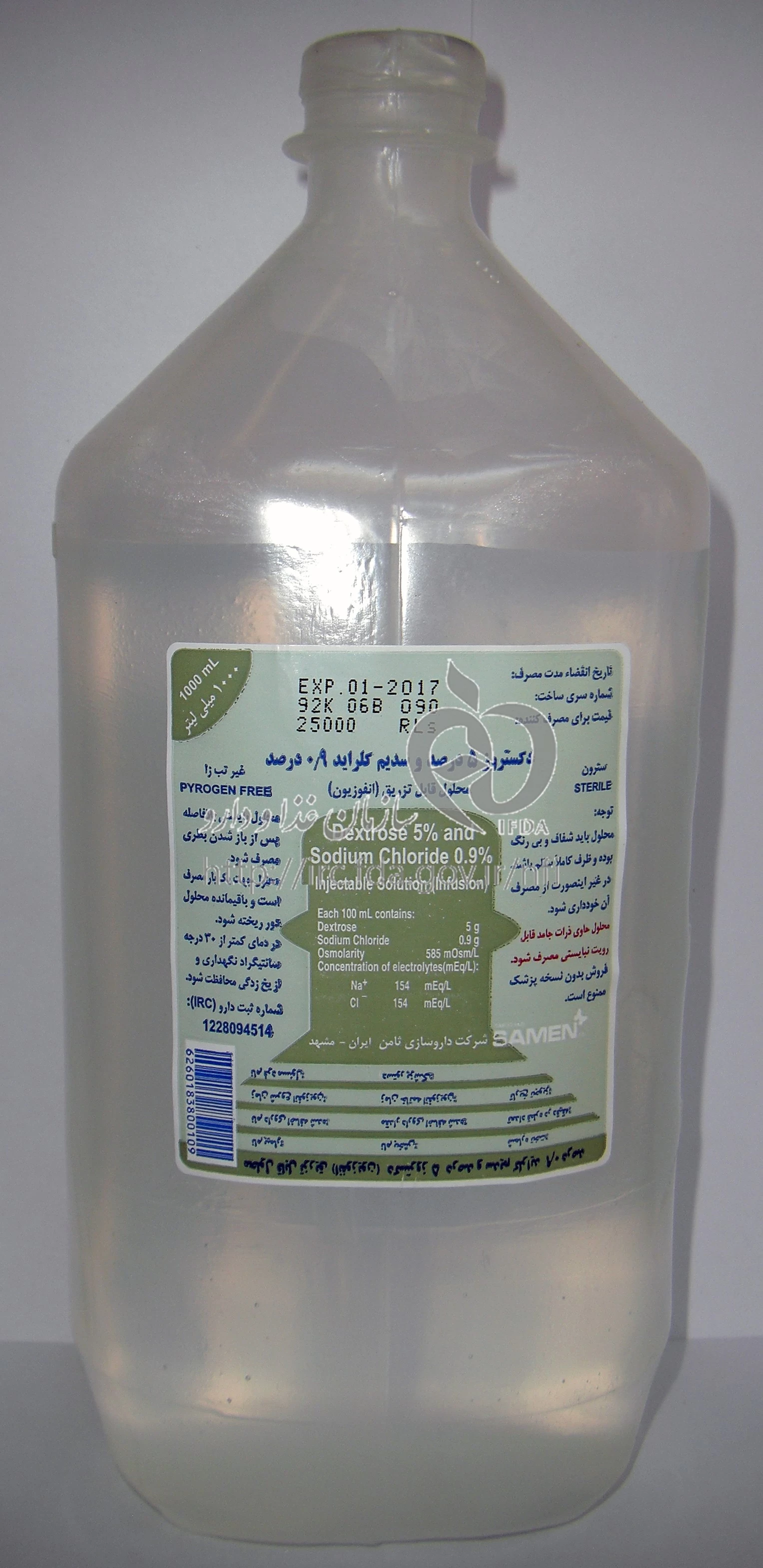 این دارو یک محلول وریدی است که شامل دکستروز (یک نوع قند) و کلرید سدیم (نمک) است. این دارو برای تامین نیازهای بدن به انرژی و الکترولیت ها به کار می رود. این دارو به عنوان یک منبع قابل جذب انرژی برای بدن عمل می کند و باعث افزایش سطح قند خون می شود. نحوه مصرف این دارو باید مطابق دستورالعمل پزشک تجویز شده باشد. این دارو به صورت وریدی تزریق می شود و میزان دوز آن بستگی به وضعیت بیمار و هدف درمانی دارد. قبل از استفاده از این دارو، همیشه بهتر است با پزشک خود مشورت کنید.