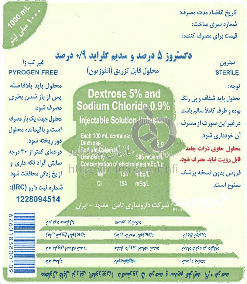 دکستروز/سدیم کلراید محلول تزریقی داخل وریدی 5 %/0.9 % 1000MILLILITER