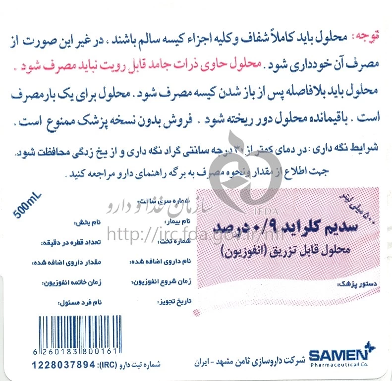 دکترها سدیم کلراید محلول تزریقی پرنترال 0.9 % 500MILLILITER