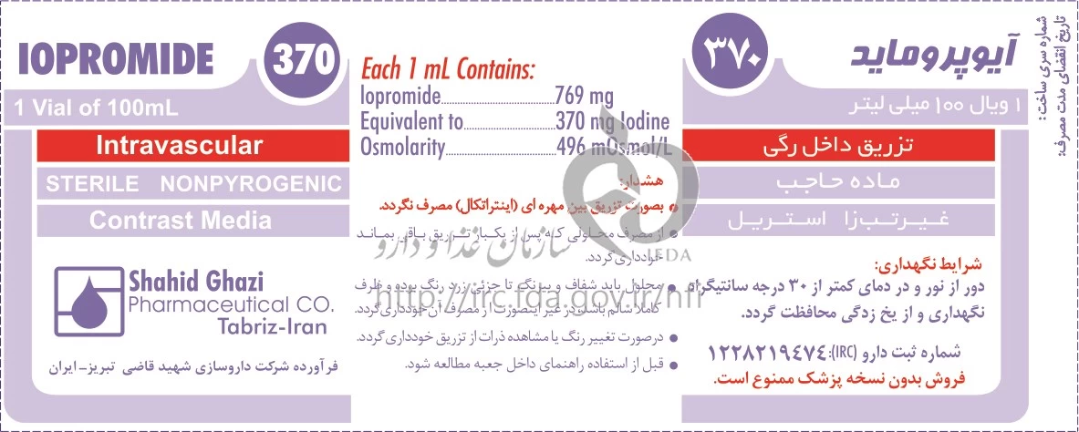 آیوپروماید تزریقی پرنترال 370 mg/1mL 100MILLILITER